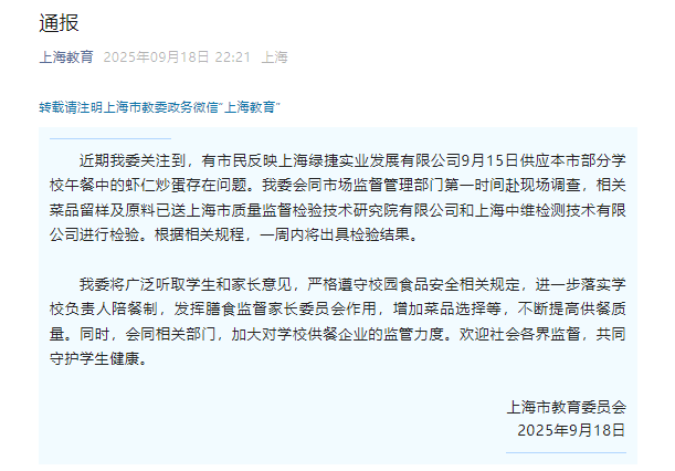 近期我委关注到,有市民反映上海绿捷实业发展有限公司9月15日供应本市部分学校午餐中的虾仁炒蛋存在问题。我委会同市场监督管理部门第一时间赴现场调查,相关菜品留样及原料已送上海市质量监督检验技术研究院有限公司和上海中维检测技术有限公司进行检验。根据相关规程,一周内将出具检验结果。
